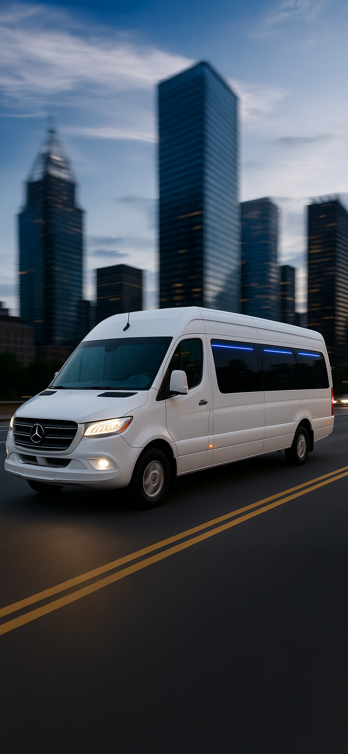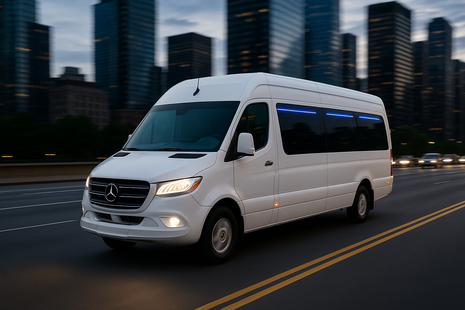Modern Mercedes-Benz Sprinter Design: Sleek white exterior with a premium, professional look that stands out day or night.