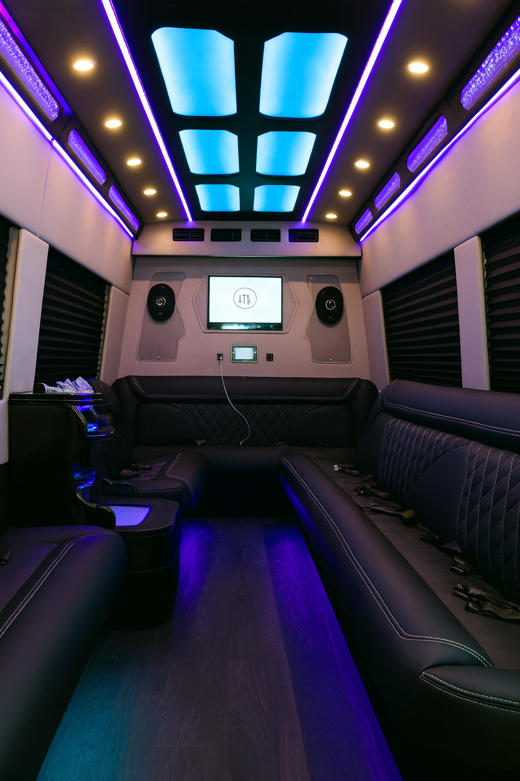14-Passenger limousine-style seating, premium lighting, and sound system